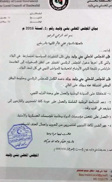 The Municipality of Bani Waleed said in a statement Saturday that it fully supports the Presidential Council of the UN-backed Government of National Accord (GNA).