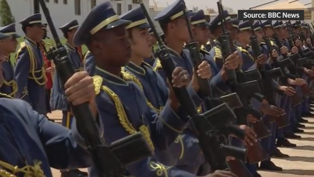 But part of the very serious trip took a more farcical turn after a military band tried to impress him with a rendition of the UK’s national anthem.