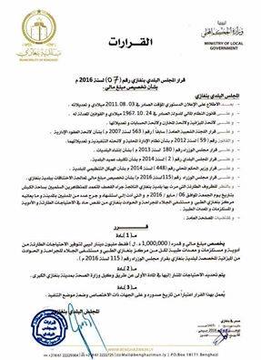 The order explains that the money should be provided from the budget of the city’s medical center and Al-Jalaa hospital according to the Prime Ministry resolution (115) of 2016, pointing that the needed equipment and other stuff should be specified by the Dpeuty Minister of Health Ministry in Al-Thinni government in the east.