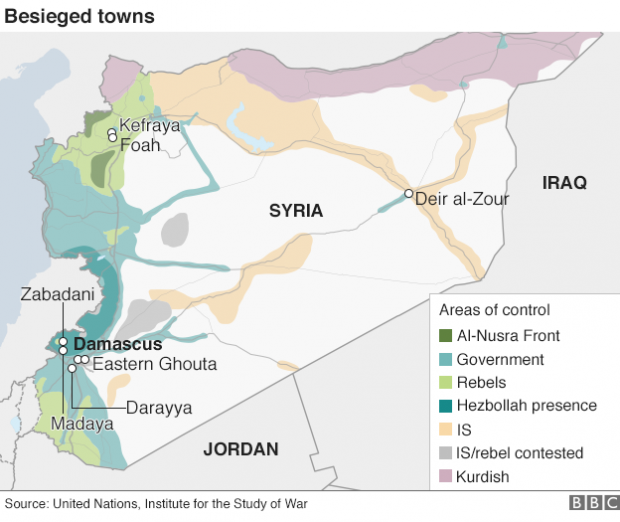 Government forces are besieging various locations in the eastern Ghouta area, outside Damascus, as well as the capital’s western suburb of Darayya and the nearby mountain towns of Zabadani and Madaya. Rebel forces have encircled the villages of Foah and Kefraya in the northern province of Idlib, while IS militants are besieging government-held areas in the eastern city of Deir al-Zour.