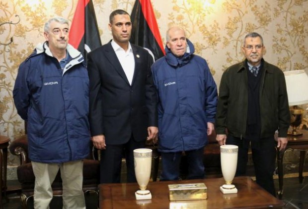 Before departing for Italy from Tripoli’s Mitiga airport, Pollicardo and Calcagno briefly appeared beside Ali Abu Zakouk, the foreign minister of the self-declared government in Tripoli.