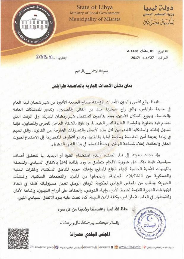The Municipality of Misurata has issued a statement denouncing in the strongest terms the violent clashes that took place in Tripoli on Friday between forces from the Salvation Government and forces from the Government of National Accord.