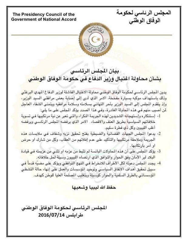 The Presidential Council of the UN-backed Government of National Accord (GNA) issued a statement Thursday condemning the attempt to assassinate the Defense Minister, Mihdi Al-Barghathi last night.