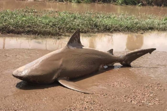 “Think it’s safe to go back in the water? Think again! A bull shark washed up in Ayr. Stay out of floodwater.”