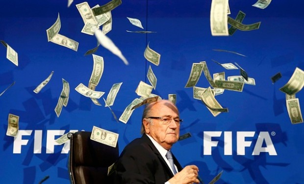 20 July We were gathered for the news conference after the Fifa executive committee meeting in Zurich. Suddenly this guy wearing a suit stood up at the front and went towards Blatter. We found out later he was the British comedian Simon Brodkin. He had two packets of dollar notes. Blatter was surprised and started saying, “Where’s my security?” When the guards arrived Brodkin turned towards Blatter and threw the bank notes in the air. I had been using a zoom lens, but I quickly changed it for a wide angle lens. The entire situation was a bit less than 20 seconds and I shot 80 frames as the notes fell slowly and perfectly around Blatter.