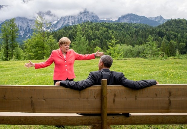 8 June We had just done a big picture with all the heads of state on that bench which is in front of Schloss Elmau [the G7 summit venue]. I spotted Obama sitting alone and I thought: that’s a nice picture. I tried to take it, but there were lots of security guards. Merkel arrived and suddenly I found my chance. The moment Merkel opened her arms was less than a second. There was no one directing the shot. It was an accident. The picture was used on front pages all over the world.