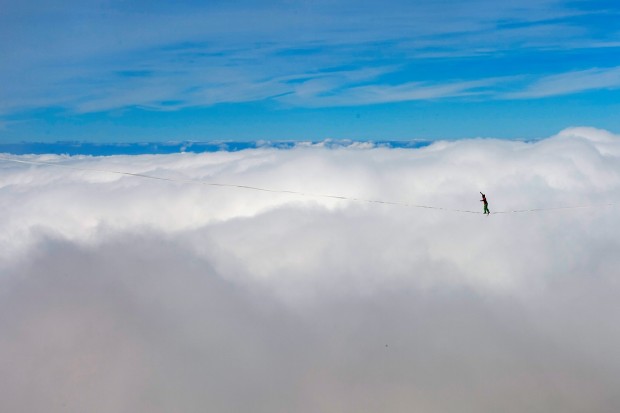 For these guys, walking across the rope without falling is a personal and artistic achievement. The highlines are always getting longer and getting higher. Here you really get a sense of the difference between this giant area of fog, and the little guy. It’s about man fighting nature, fighting the elements, and fighting against fear.