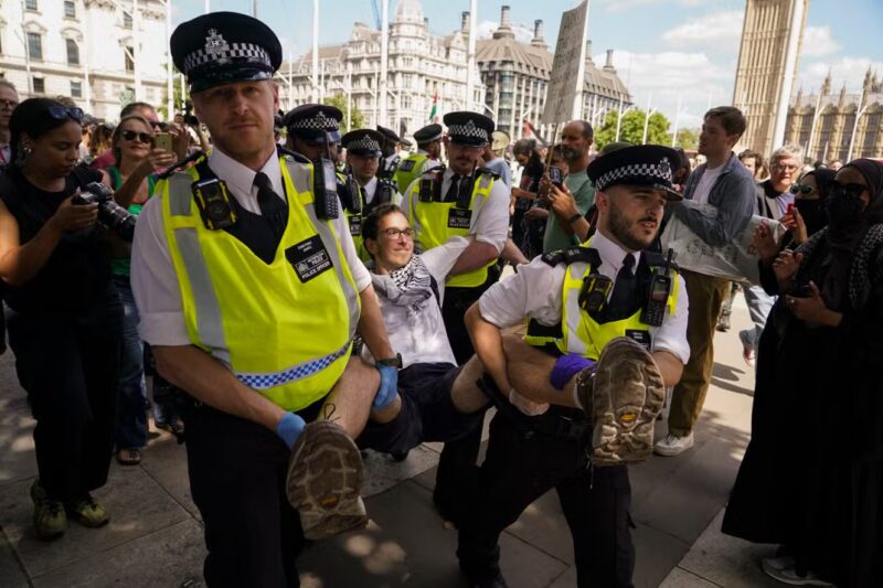 Rights groups warn of dangerous precedent after London Palestine arrests. Photo via AP