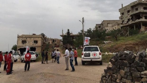 The International Committee of the Red Cross and Syrian Red Crescent convoy is the first to reach Rastan since 2012.